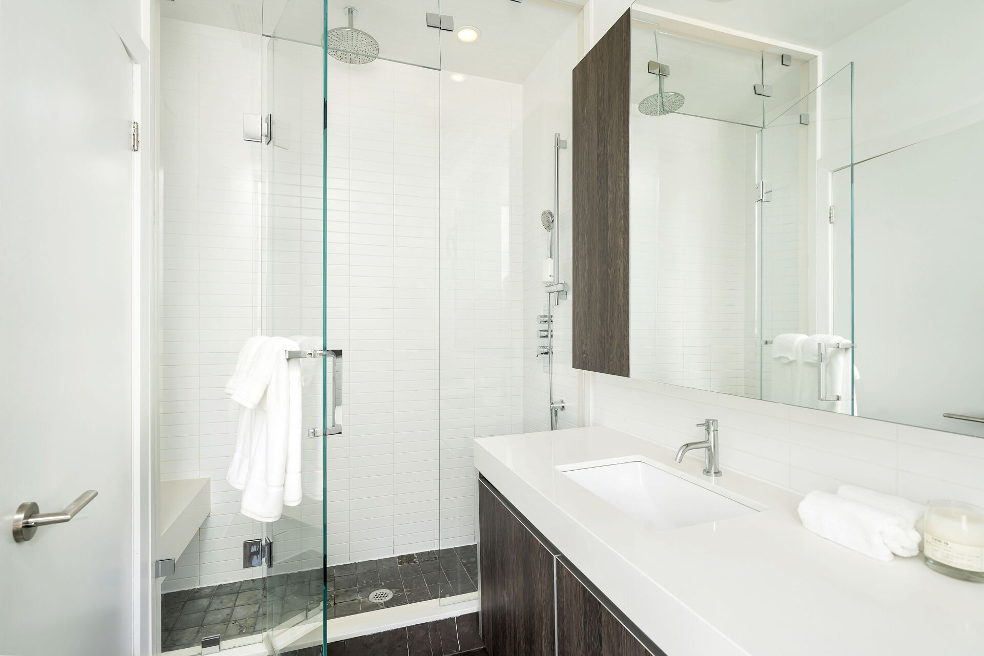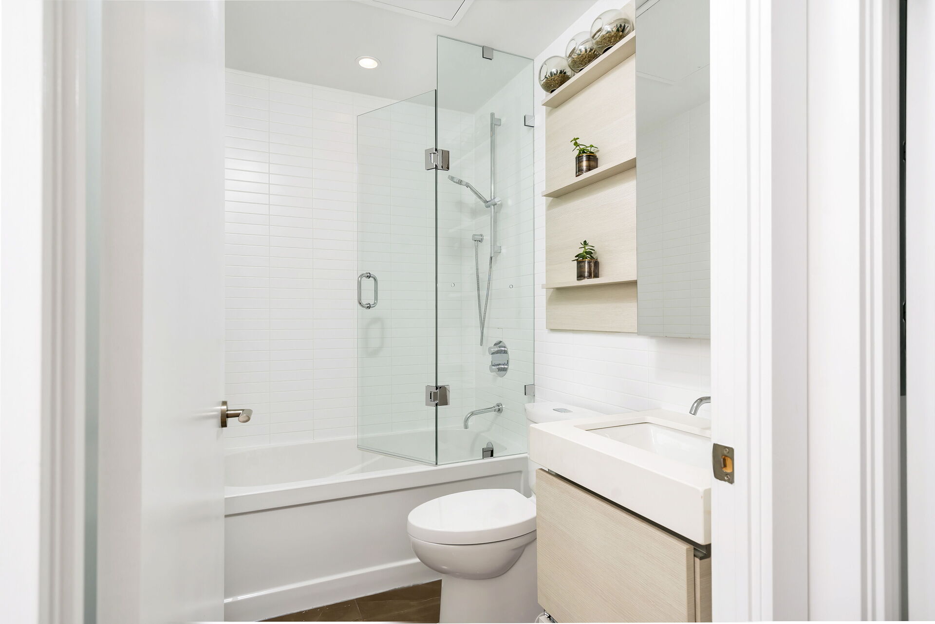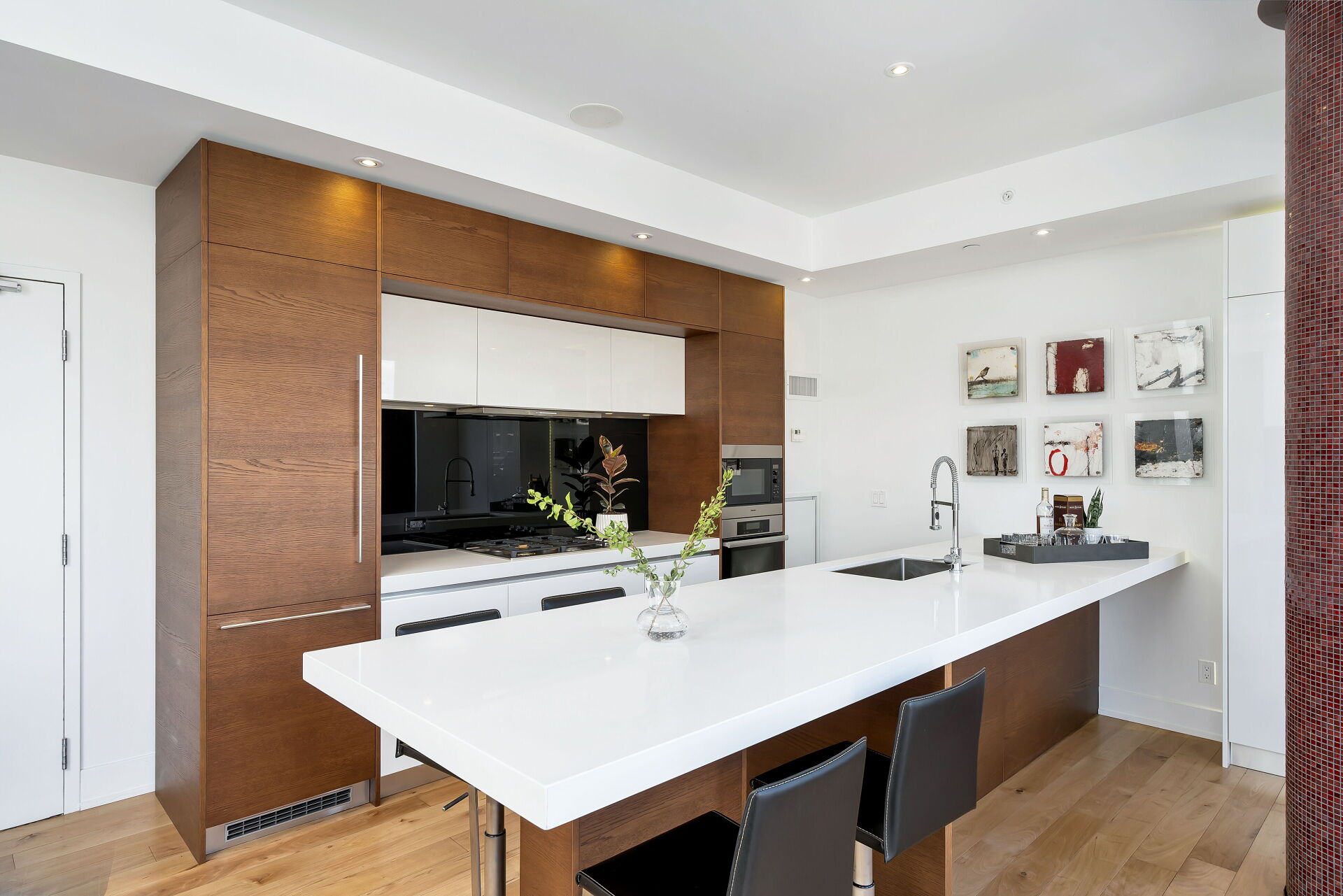 One of the standouts of this unit is the custom Muti Italian kitchen with fully-integrated appliances, extended cabinets and soft-closing cabinetry, which also features a floor-to-ceiling pantry with LED accent lighting. You will also never have to worry about having enough storage space as 704 has custom closet organizers with back-painted sliding-glass doors, storage space in the laundry room and comes with multiple lockers for use in the building.