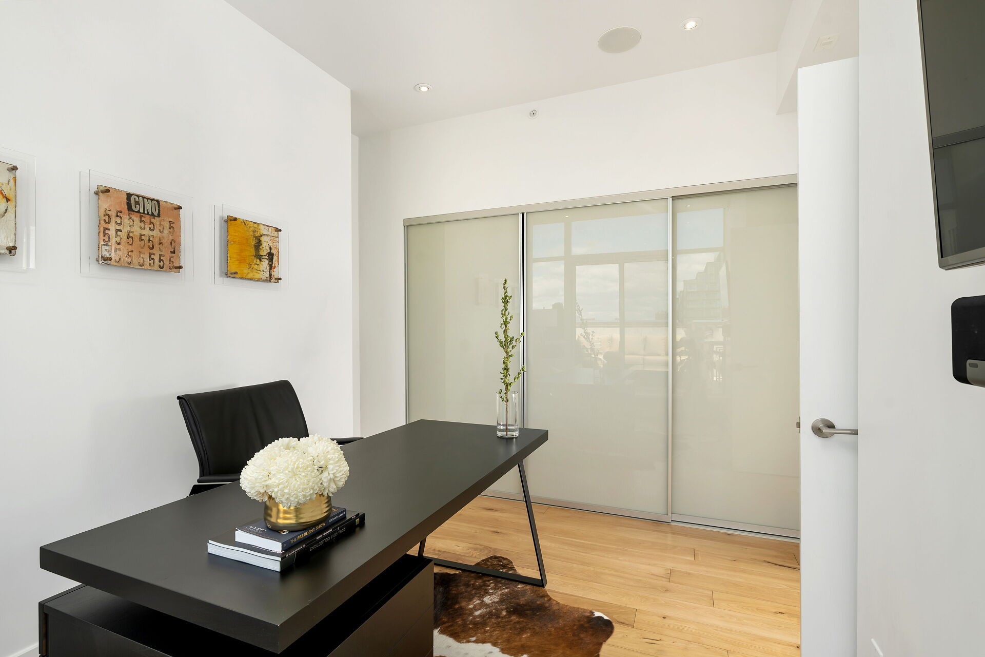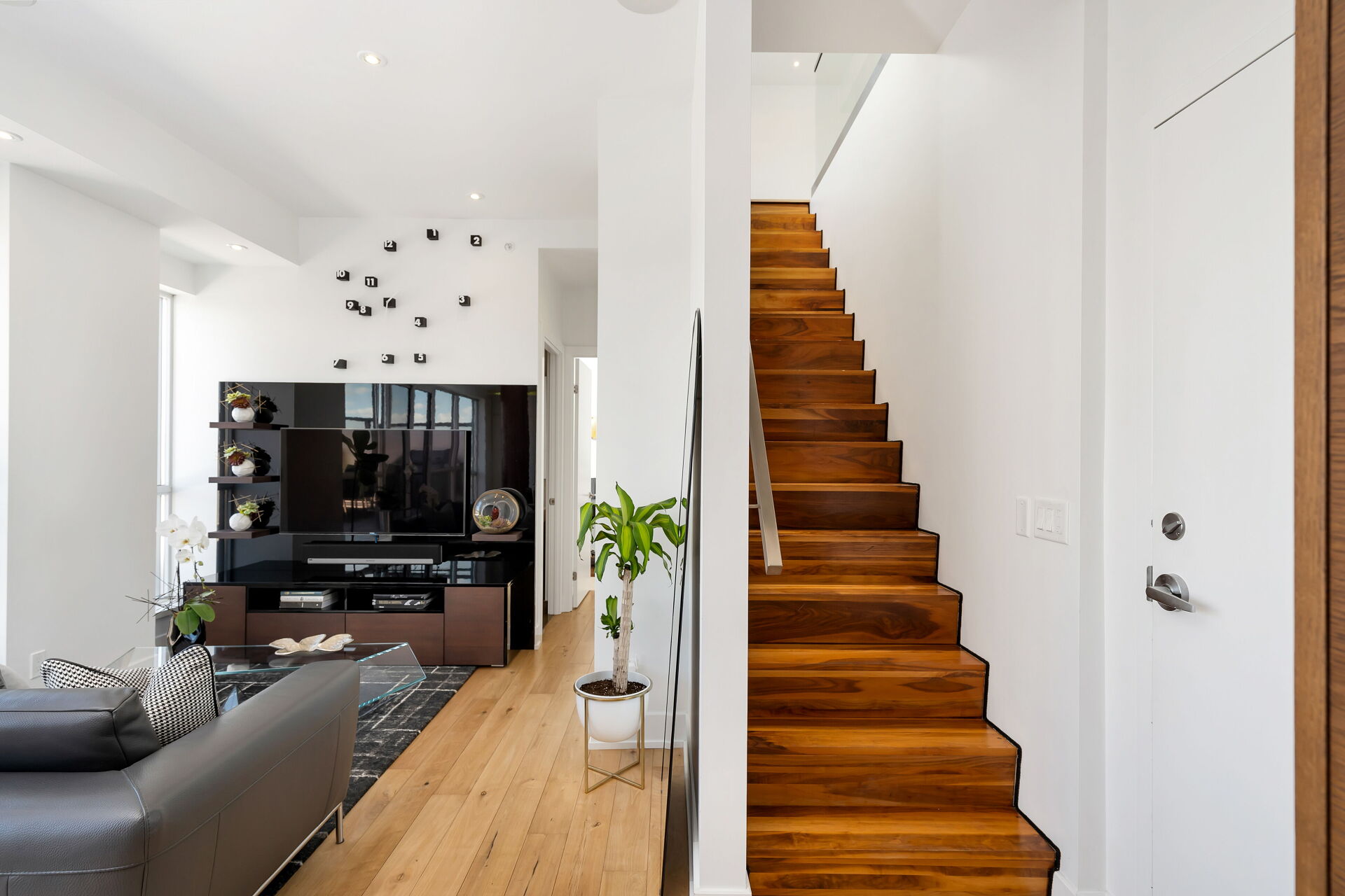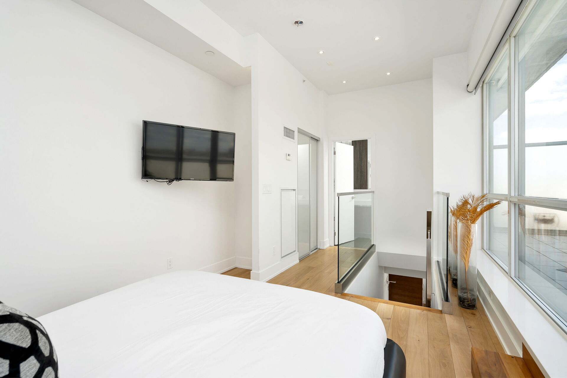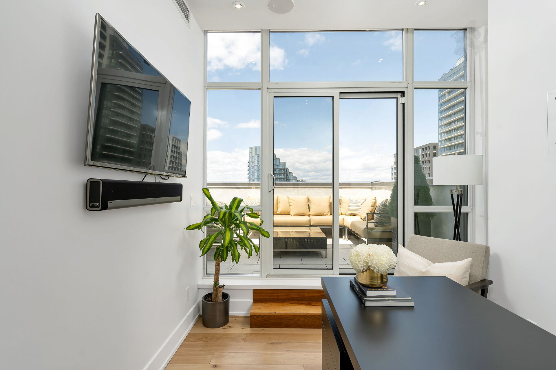 With floor to ceiling windows throughout, the Northwest facing corner unit offers North, West and East views of Downtown, Toronto. The condo exudes luxury with upgraded finishes from Miele appliances, a built-in wine fridge, Caesarstone Quartz countertops, bespoke 5 1/2” American Walnut engineered hardwood floors and staircase, and 10 ft ceilings, which offer plenty of natural light and space.