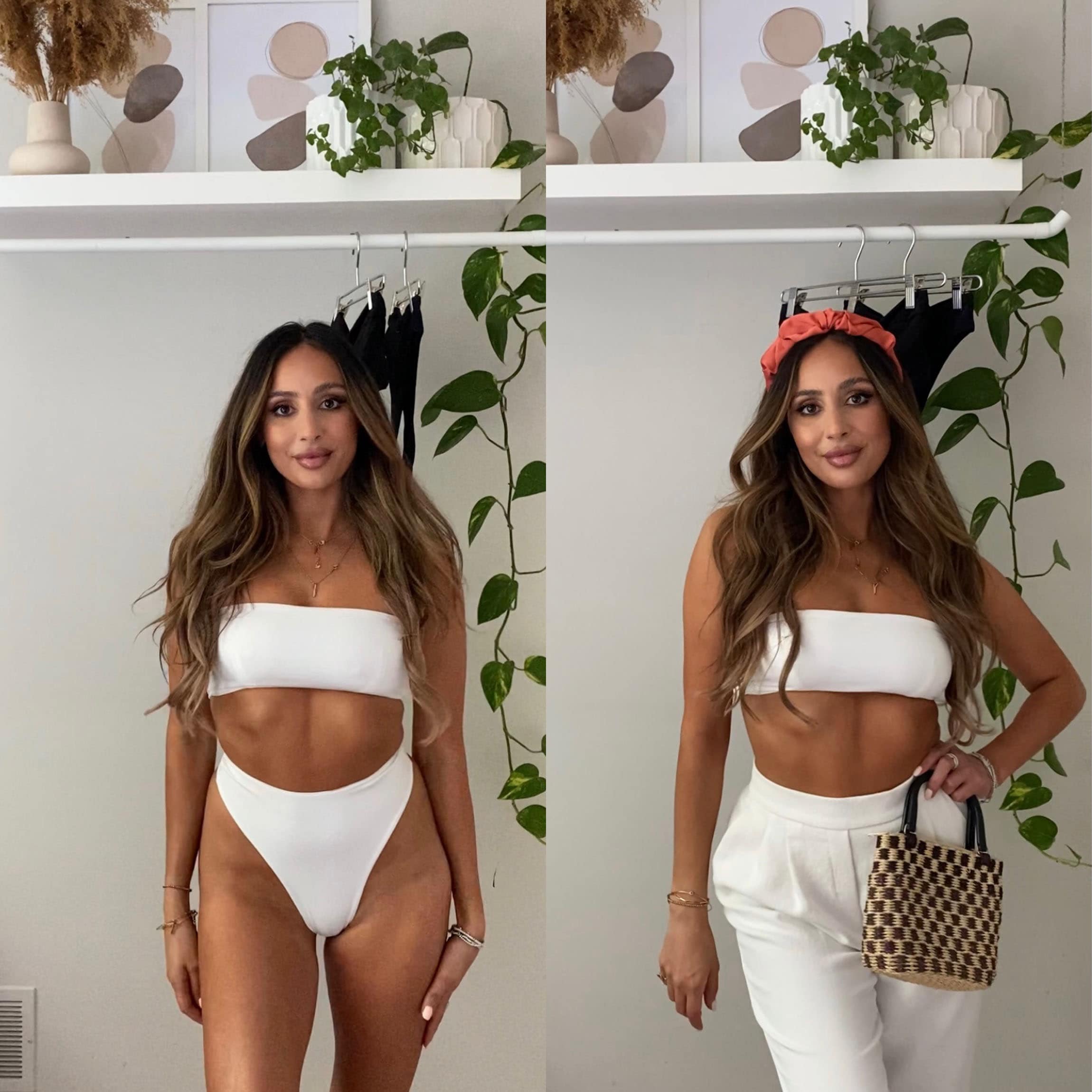 In the second look, Rebecca wears the Aubrey set in white, a bandeau-style top and high wasted bottoms. In this look, Rebecca pairs her bandeau top with high wasted white pleated trousers and accessorizes with a cute handbag, adding a fun pop of colour with a headband- the perfect picnic day look. This look can be replicated with any pants, including jeans or shorts.