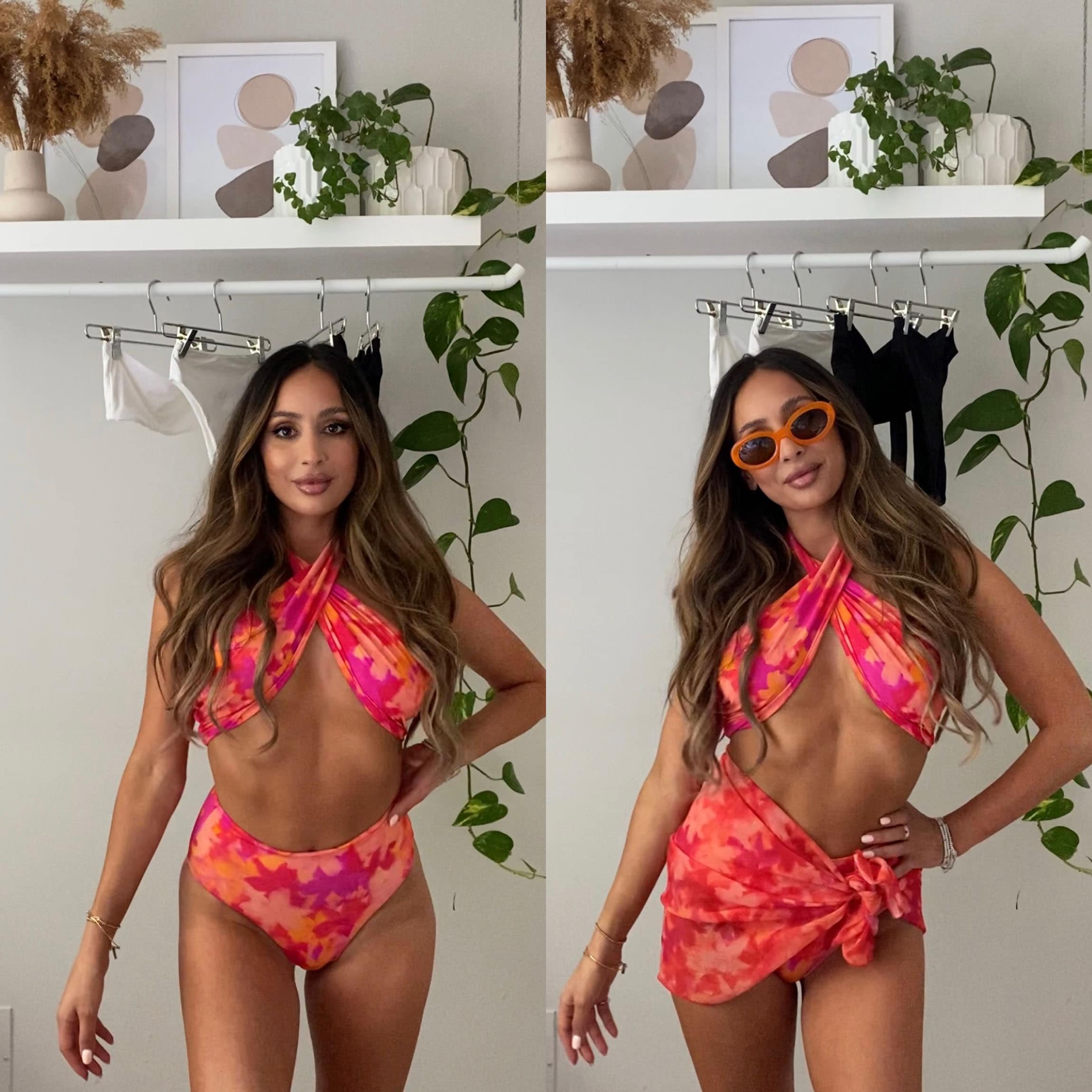In the first look, Rebecca gets you pool-party-ready with the Leo x Lily Flora set. This is the most versatile top from the collection, as you can wear it 8 different ways. Walking around pool-side like Rebecca, you can throw on a chic pair of orange oval sunnies, and the matching cover-up for the perfect outfit. No cover-up? Throw on an oversized linen button-down instead.
