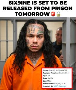 April 3, 2026 – A new development involving 6ix9ine is gaining attention after what appears to be prison record details began circulating online, pointing to a potential release date of April 4, 2026.