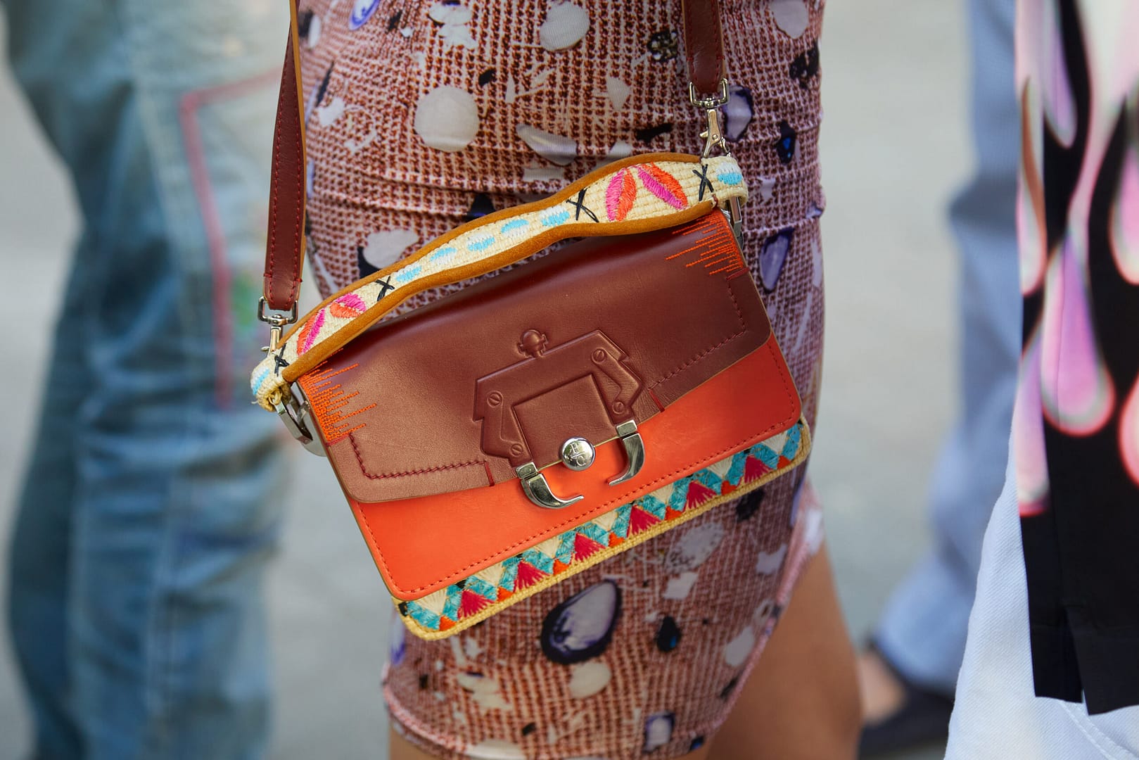 MILAN, ITALY – JUNE 18, 2022: Woman with Paula Cademartori bag in brown and orange colors and embroidered details before Marcelo Burlon County of Milan fashion show, Milan Fashion Week street style