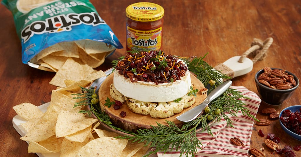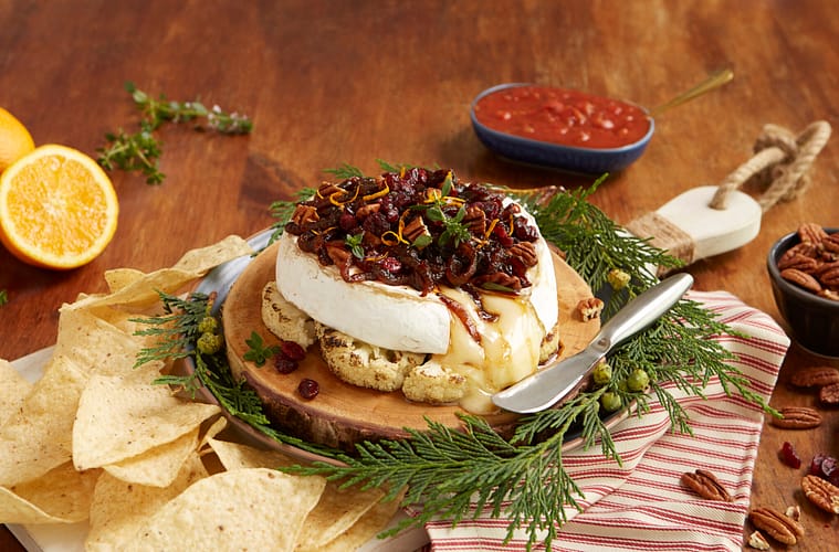 - In a separate pan heat oil on high and place both cauliflower steaks down and cook for 3 minutes per side to get a nice golden brown sear on both sides, then transfer it to an oven at 375F for 10 minutes. Top with brie and caramelized onions and place back in the oven for 5 minutes. Remove from oven and place on a board surrounded by Tostitos® Restaurant Style tortilla chips and garnish with the crushed pecans, chopped dried cranberries, zest from 1 orange, chopped chives and Maldon salt to finish.