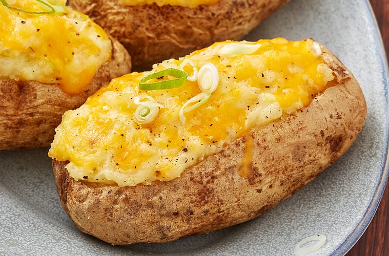 - Fill baked potatoes with potato mixture and place back in the basket of the Air Fryer. Top with remaining ½ cup of cheddar. Cook at 400° until the cheese is melty and outside is crispy, 5 minutes.
