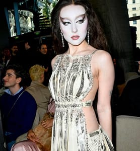 Only a couple hours later, Chappell attended the Rick Owens show at the Palais de Tokyo. This time she wore another silver dress, but this one had a large cut out at the midriff and bust. Moreover, the strapless dress was paired with leather Morso boots with vampiric teeth as heels.