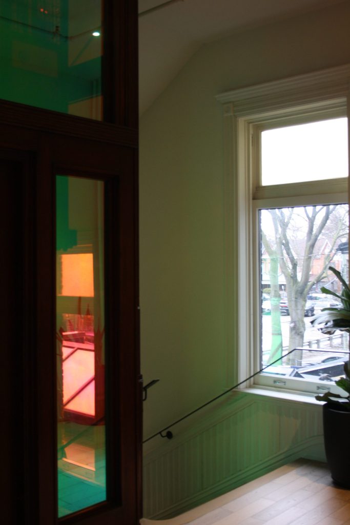 A recent extensive renovation revived the building originally built in 1889 and harnesses the heritage with special touches kept un-changed that compliment brand new finishes, giving new life to the Gladstone House look and feel. With strong and modern first impressions, the outside entryway showcases the same dichroic film seen with the elevator. No photo spoilers here, it’s best seen in-person for the first time.