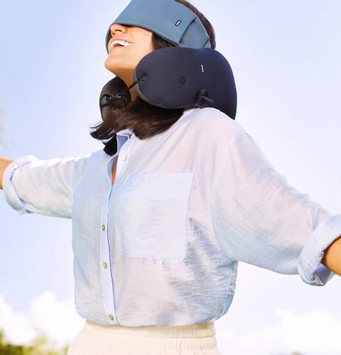The neck pillow is another great product. It is made with the same technology as the face mask and sleep mask. It comes with an adjustable strap and a very comfortable interior with padding to keep your neck and your head supported. It’s made with dynamic thermoregulation and a pouch to put it away for safe travel. With three different color combinations available, it is the perfect item for traveling.