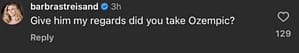 In the clip, the TikToker explains that Streisand allegedly commented on McCarthy’s Instagram: “Give him my regards did you take Ozempic?” It seems as though this may have been an accidental comment as it was soon deleted- not before, however, the internet got a hold of it.