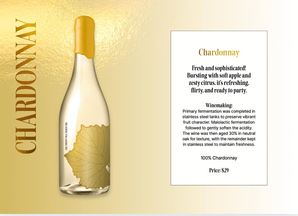 Their inaugural release, of the Gold Leaf Collection, features three meticulously crafted Ontario VQA wines with 100% of each grape labeled in the bottle (they are single varietal wines, never blended) from the limestone rich Niagara Benchland sub-appellation of Twenty Mile Bench. Each label showcases the leaf of the variety in a metallic and pastel cover meant to attract your eye and educate consumers about ampelography – the study and identification of grapevines, particularly based on their physical characteristics. It is an art that bridges the gap between tradition and innovation, capturing the story of each grapevine and their journey from the vineyard to the glass.