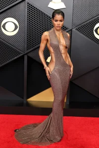 Teyana Taylor’s custom Tom Ford gown relied on engineered cutouts and seam tension to sculpt the body without visible boning. The densely embellished surface demanded internal stabilization, balancing sensual exposure with architectural restraint.