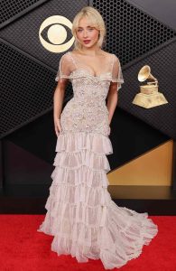 Sabrina Carpenter’s custom Valentino gown layered a fitted, embellished bodice over cascading tiers of tulle. Each tier was graded for volume without bulk, therefore creating an airy finish supported by couture-level structure.