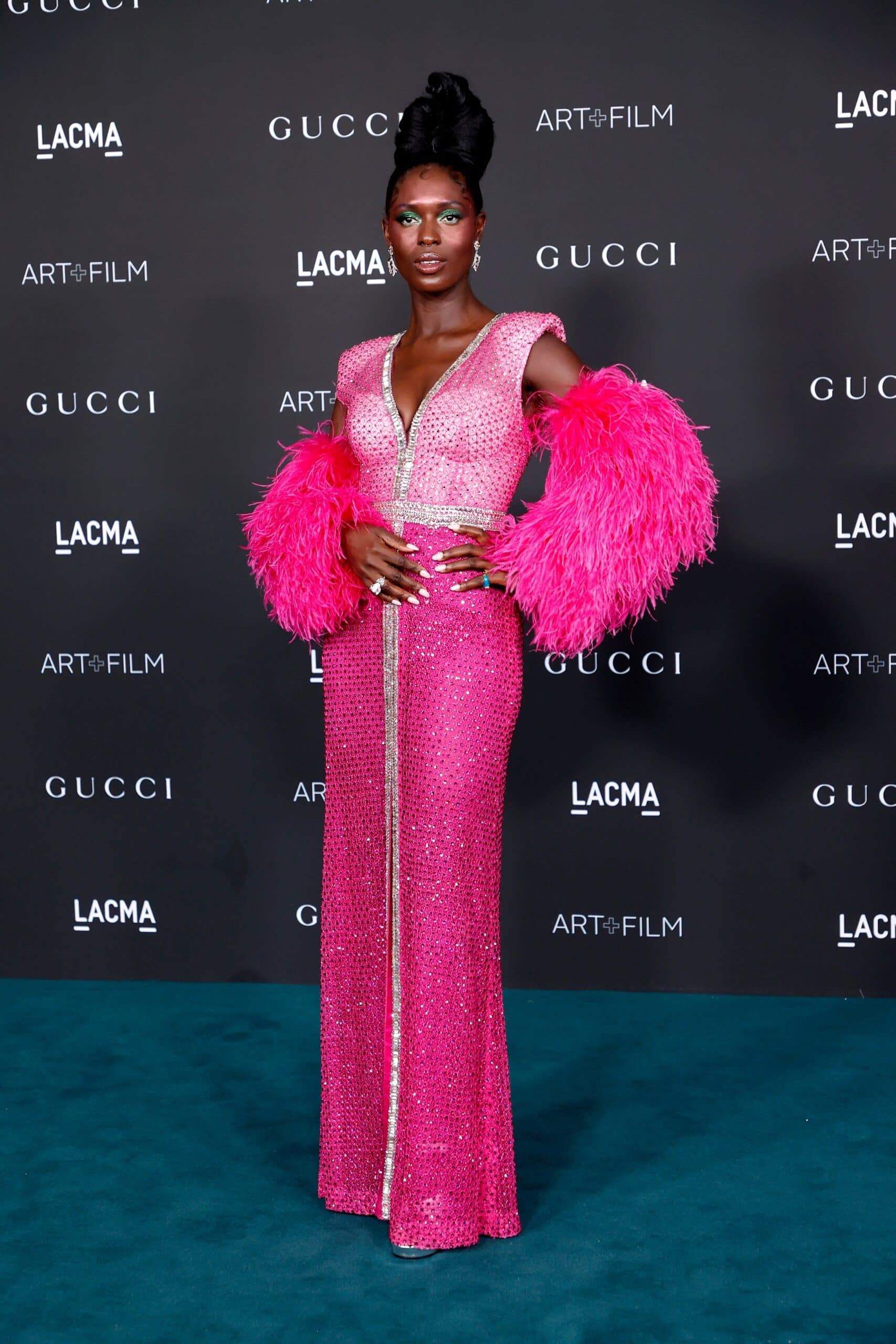 At the LACMA gala in Los Angeles, Jodie Turner-Smith was similarly stunning in a Barbie pink Gucci dress accented by a matching magenta feathered stole.