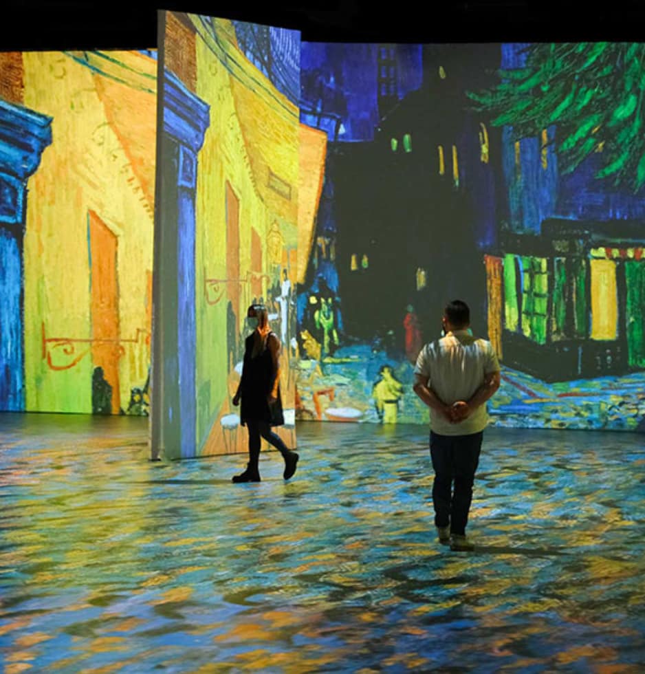 As you make your way through the presentation, you’ll notice the walls enveloped in an array of light, colour, and shapes that dance, swirl, and refocus into flowers, cafes, and landscapes. In an incredible production of events, masterpieces come alive, floating across multi-surfaces and intriguing your senses. Not only is this an immersive experience you don’t want to miss, but once you have the opportunity to visit, you will find yourself with a newfound appreciation of the work of Van Gogh.