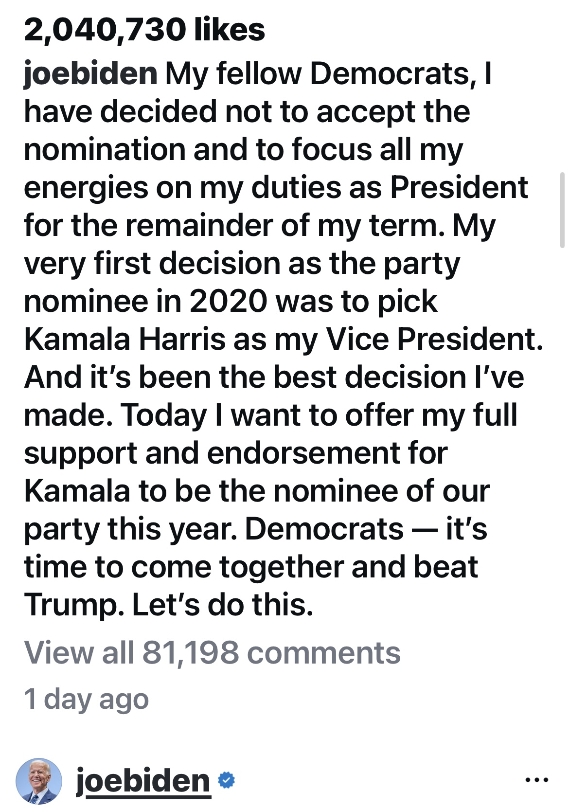 Today, he released an official statement, as seen on his Instagram account, withdrawing from re-election and endorsing Vice-President Harris.