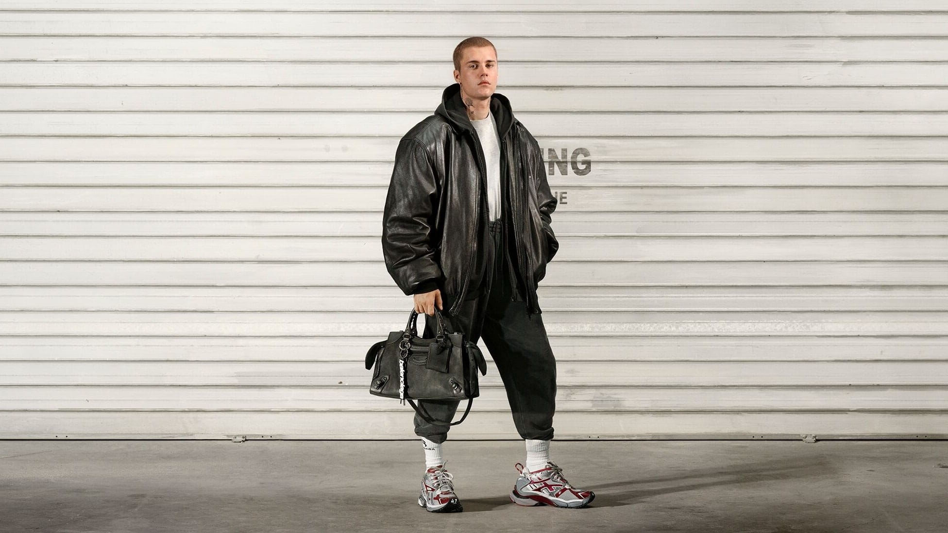 The campaign was shot by American photographer Katy Grannan and the setting matched the vibe that Balenciaga was going for. Bieber is seen with a fresh buzzcut, and to match his look he is seen in an oversized black leather bomber, classic t-shirt, black high-waisted track pants tucked into sweat socks and paired with nothing less than a classic dad shoe, to complete the look Bieber is holding a black leather motorcycle bag.