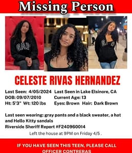 Celeste Rivas had gone missing from Lake Elsinore, Riverside County, in April 2024, aged 13 at that time.