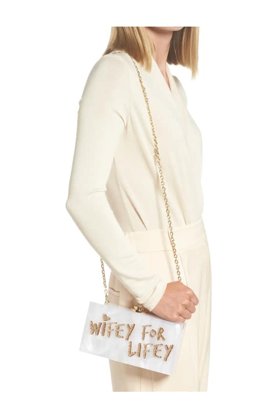 The Sophia Webster Wifey For Lifey Box Clutch is a cute and chic way to carry all of your essentials while also telling the world of your new special status.