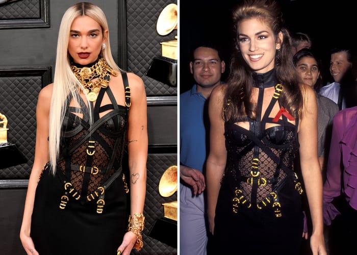 This past Sunday Dua Lipa wore not one but two Versace looks to the Grammys. Her red carpet look may have looked quite familiar to some as she wore the same dress that Cindy Crawford wore in 1992.