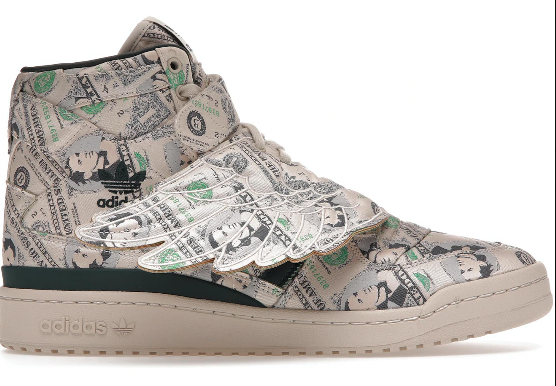 The original Adidas Original Wings shoe was a representation of the brand’s original prices of Adidas shoes which would cost about $100, so the pop/camp style of Jeremy Scott came into play and they created the Wing shoe “Money” which had the iconic Wing on the shoe but was covered in American money.