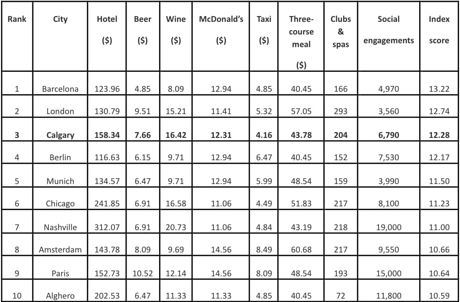 London comes in second, with 120 clubs and 173 spa listings in the UK’s capital being one of its ranking factors, as well as its cheaper prices ($11.41) for an end-of-the-night McDonald’s or equivalent. Calgary, the only Canadian city to feature on the list, follows in third with a taxi ride starting at $4.16 and a beer setting you back $7.66.