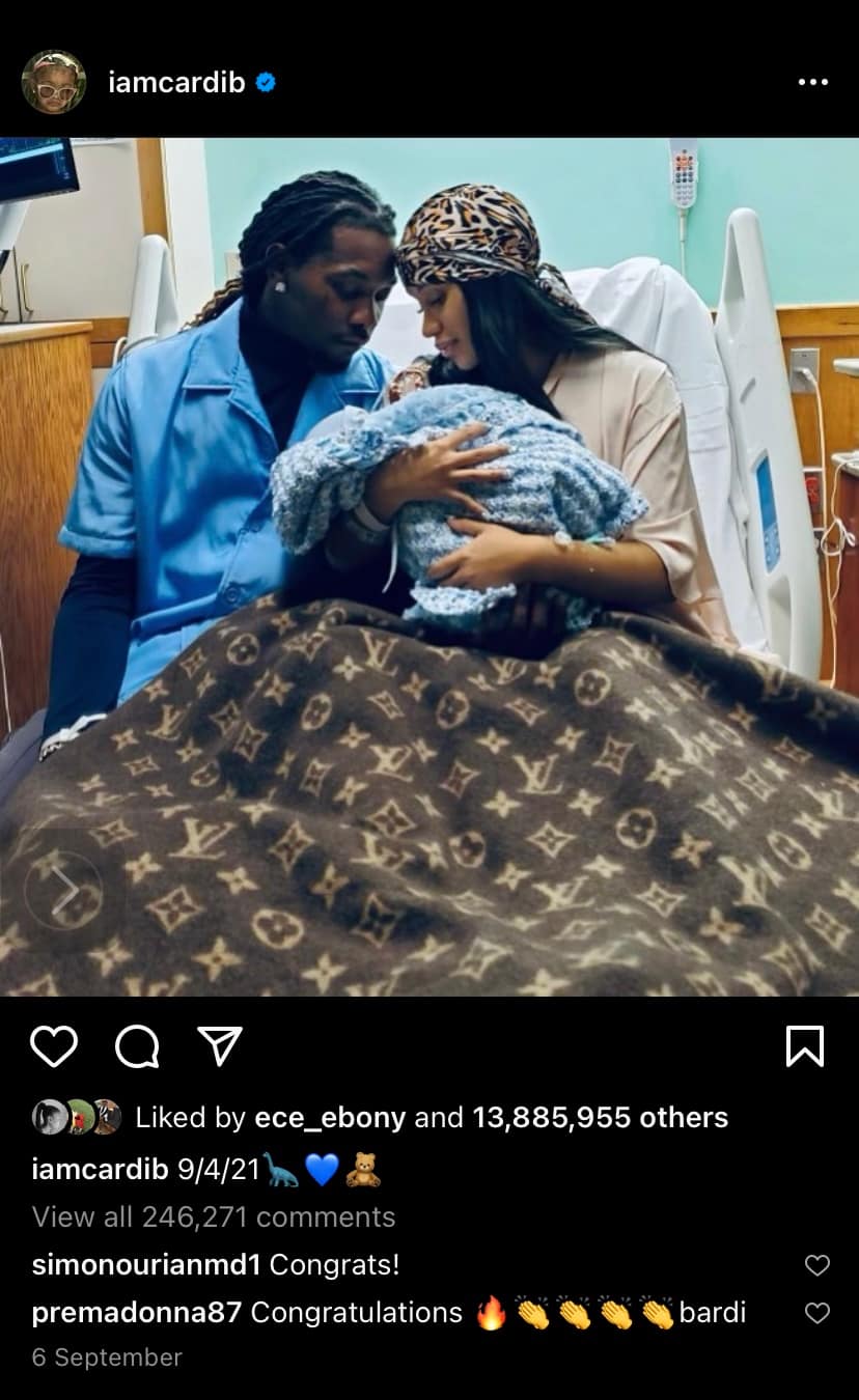 CardiB and husband Offset welcomed their second child together a son, on Saturday, Sep 4th as she took to Instagram to break the news with an adorable photo of her with her husband in the delivery room.