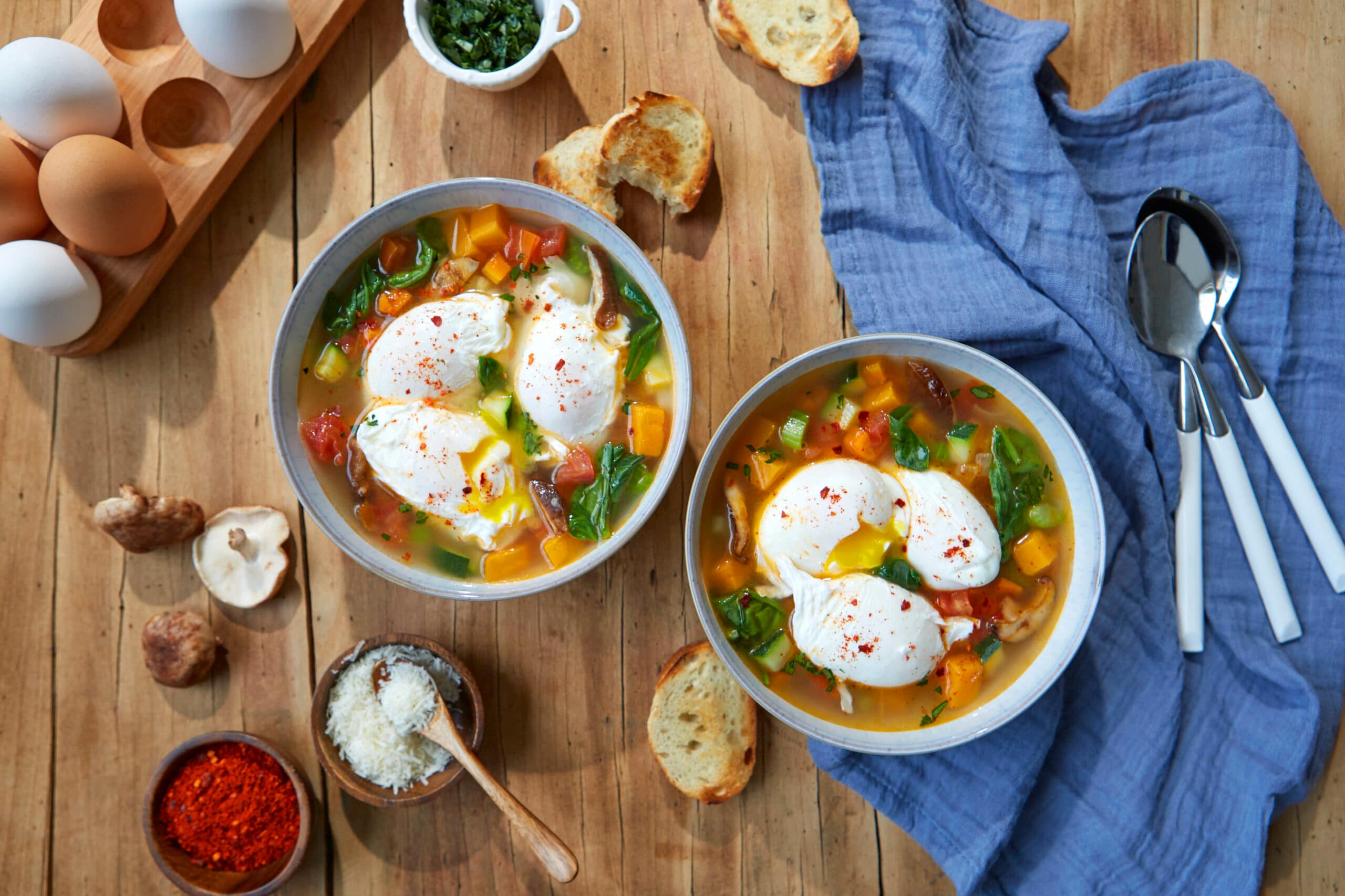 Chef Kimberly developed this comforting soup to enjoy on a chilly afternoon or evening. She took inspiration from the rich flavours of Portugal and Morocco when creating this dish, which is chock full of flavour and protein, thoughtfully combining fresh herbs, veggies, and the star of the show- eggs.
