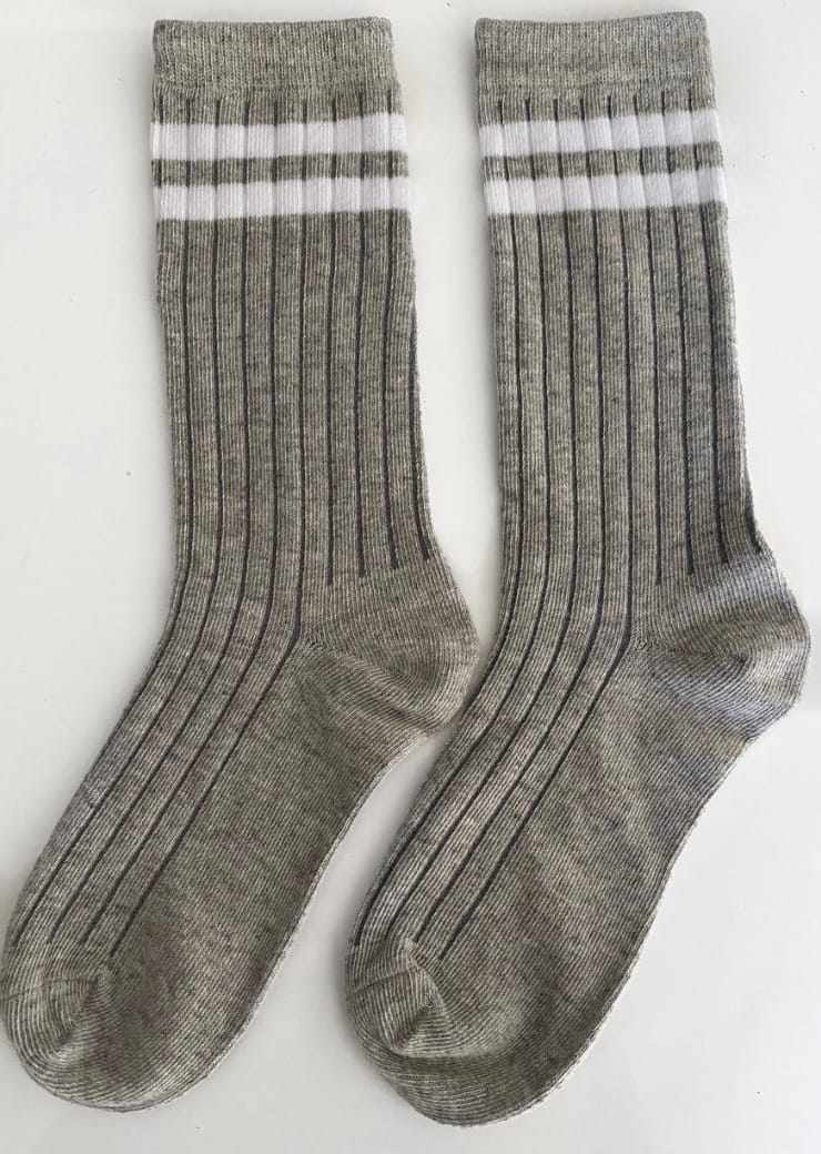 These grey knit socks are super cozy and comfortable. Featuring a white stripe detail, these socks will add a fun and sporty look to your fit. Pair them with your playsuit or matching set for some added flair!