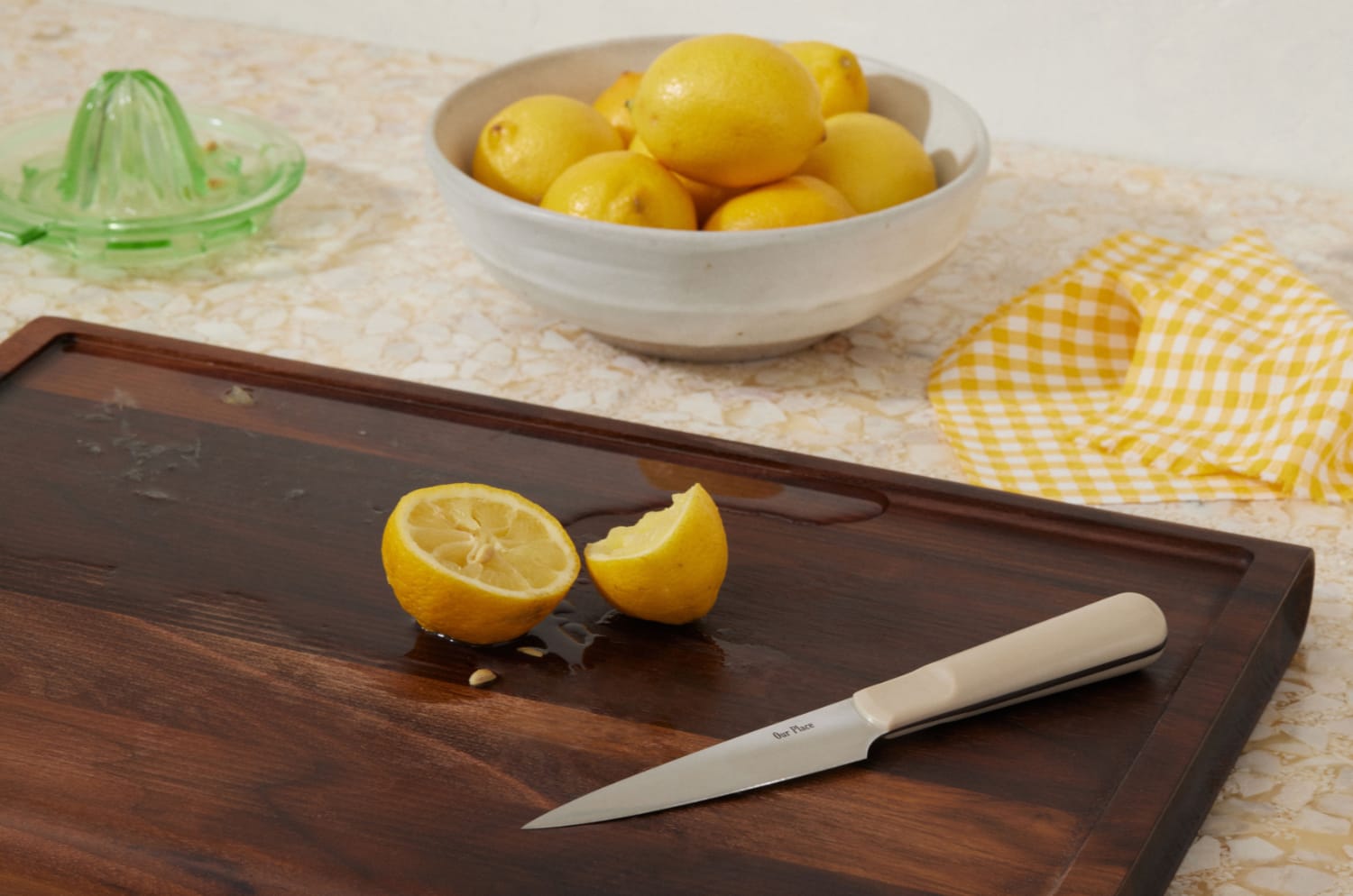 Of course, every cook needs a trendy cutting board to accompany their new knife set. The Our Place cutting board is made from the highest quality American Black Walnut wood and features a built-in juice trench, which catches liquids and limits the chance of mess. The opposite side, which is completely flat, can also be used as a serving board.