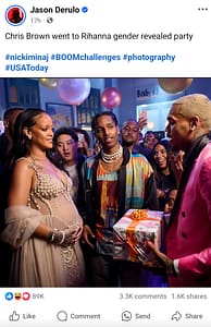 A Reddit post featuring a manipulated image of Rihanna, Chris Brown, and A$AP Rocky at a fictional gender reveal party has gone viral, sparking widespread controversy.