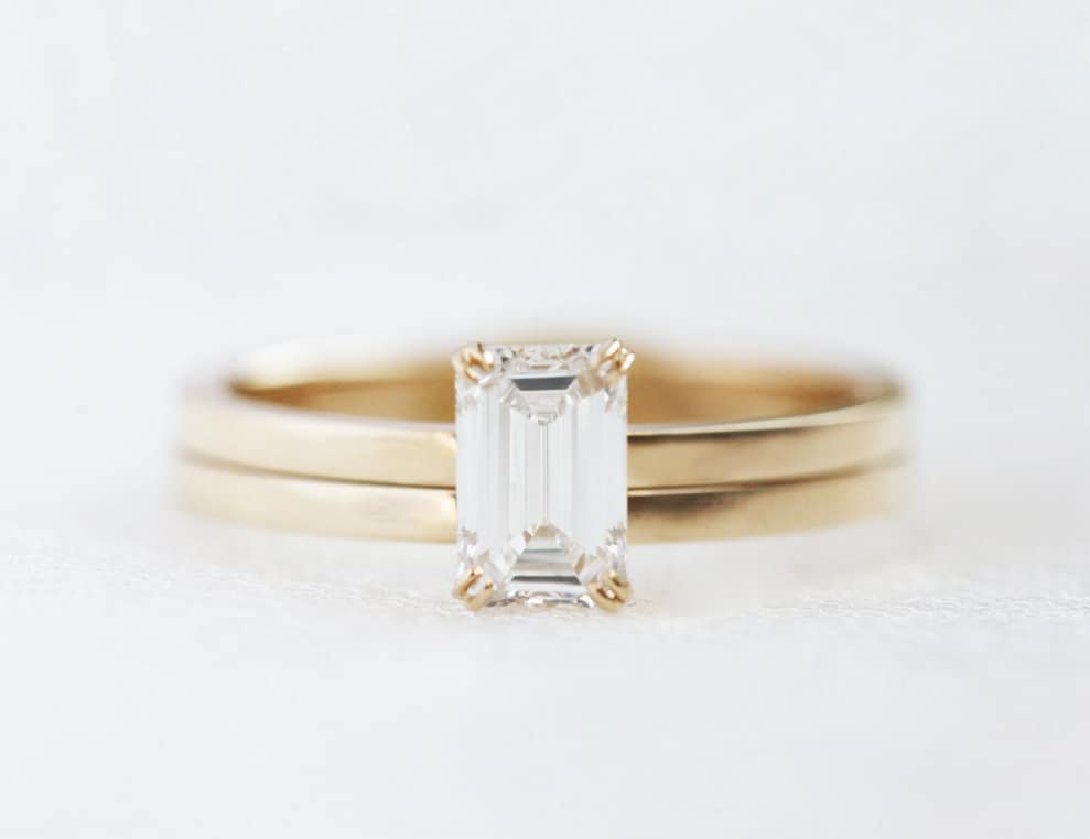 There are two main styles. A matching set uses a straight band that sits flush beside the engagement ring. A nesting set uses a shaped band that curves around the center. Both can be beautiful when the scale, height, and details line up.
