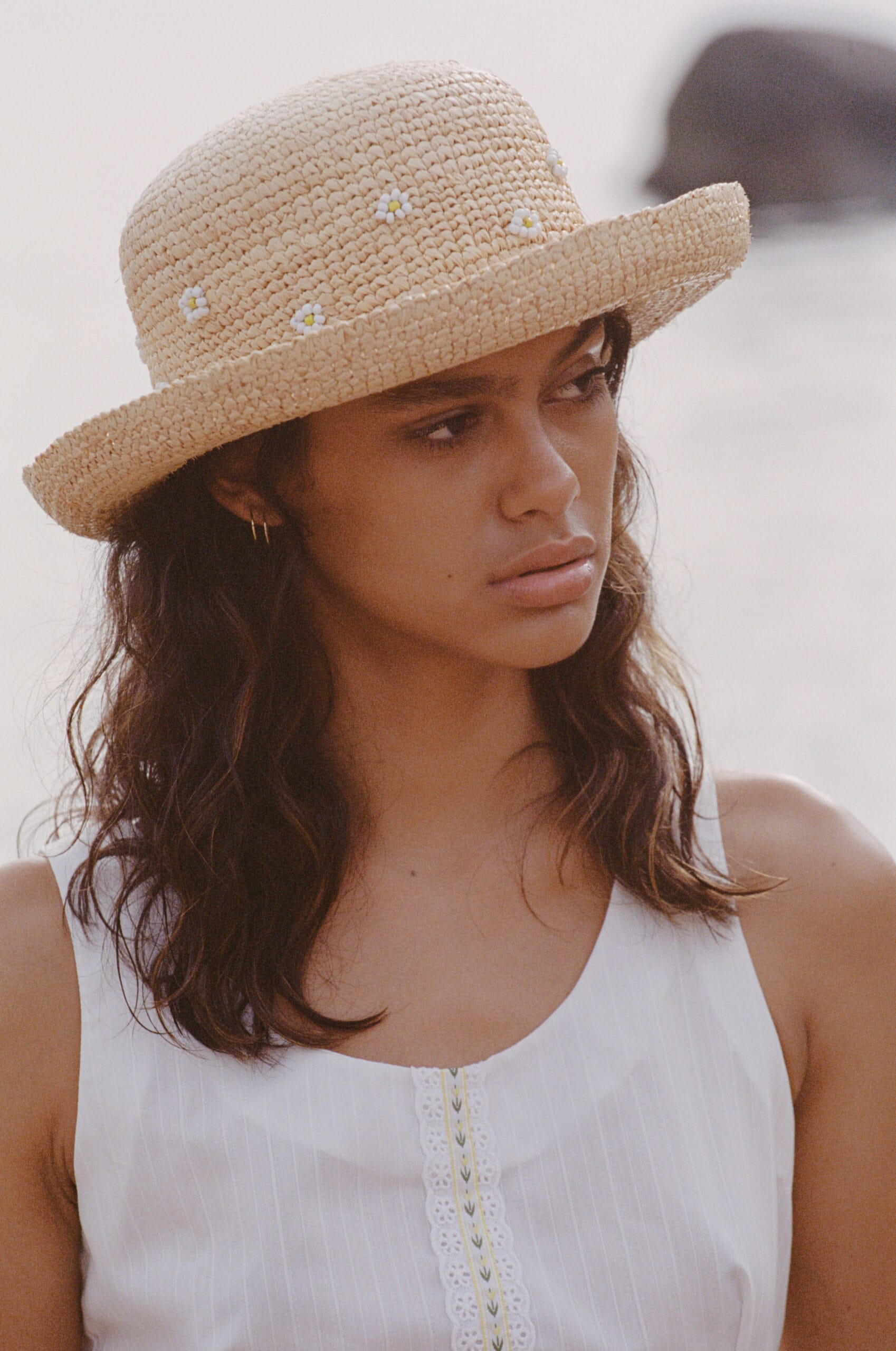 Delight in the whimsical charm of the Daisy Cruiser, a woven raffia straw hat adorned with hand-beaded daisies and a flicked edge—a perfect companion for embracing the carefree spirit of summer and adding a touch of enchantment to your sun-soaked adventures.