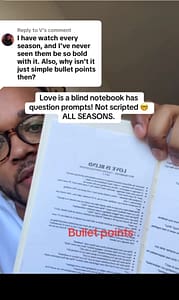However, these claims have been quickly debunked by other cast members who have appeared on the show. According to former contestants, the notebooks provided to the participants are filled with question prompts designed to help guide conversations, not scripts. These prompts are intended to help the contestants navigate the challenging and sometimes awkward experience of talking to someone they cannot see, fostering a deeper emotional connection. The goal of the question prompts is to assist the participants in keeping the conversation flowing naturally as they explore their potential relationships.