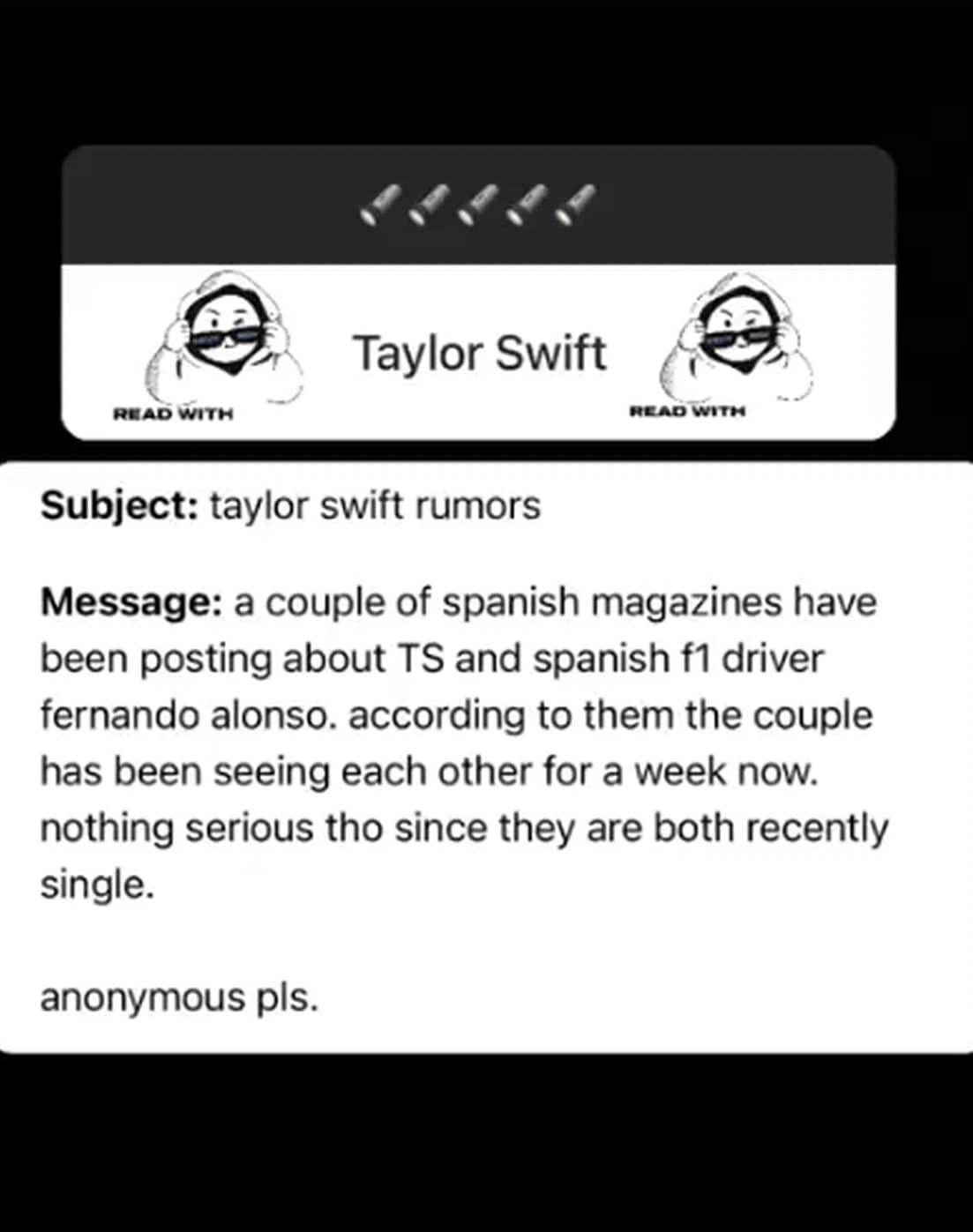 “A couple of Spanish magazines have been posting about TS [Taylor Swift] and Spanish F1 driver, Fernando Alonso.”