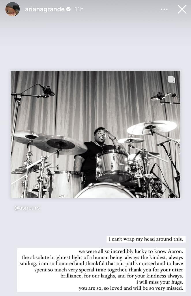 Ariana Grande shared an Instagram story in which she wrote, “I can’t wrap my head around this. We were all so incredibly lucky to know Aaron. The absolute brightest light of a human being. Always the kindest, always smiling. I am so honored and thankful that our paths crossed and to have spent so much very special time together. Thank you for your utter brilliance, for our laughs, and for your kindness always. I will miss your hugs. You are so, so loved and will be so very missed.”