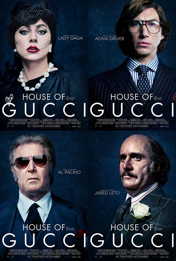 A polished wardrobe is an obvious essential for a film portraying arguably the most influential fashion house of all time. Thankfully, the current head of Gucci Marco Bizzari allowed the production “total creative freedom”, granting the cast complete access to the fashion houses archives for props and wardrobe. To read about Gucci sneakers released this year constructed with vegan materials, check out this article from HOLR.