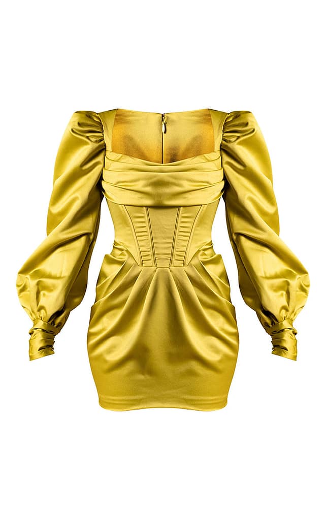 PrettyLittleThing – Premium Olive Constructed Satin Extreme Puff Sleeve Mini Bodycon Dress
