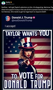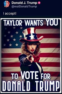 As shown here in this related article, Trump allegedly reposted the above image featuring an AI-generated image of Swift’s face along with the words, “Taylor Wants You To Vote For Donald Trump.” Trump commented “I Accept!” on the image when reposting it.