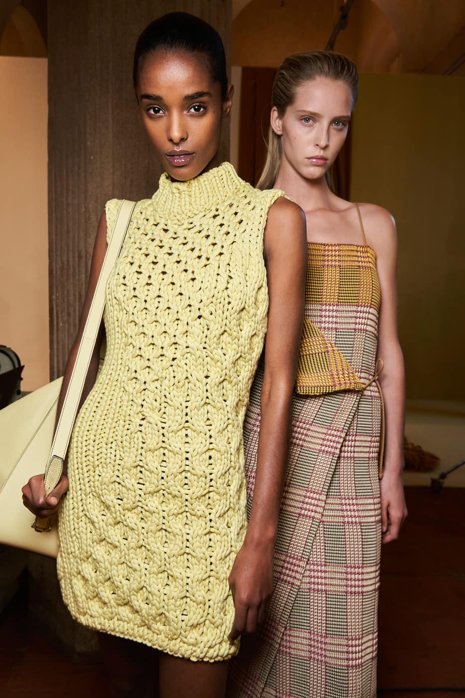 The show’s combination of a rock/punk aesthetic and casual resort wear silhouettes culminate in a minimalistic bohemian look. The monochrome looks are balanced out with statement pieces such as a blue caftan and a mustard trench. In true Ferragamo style, each garment follows a strict structure while also following the fluidity of the body.