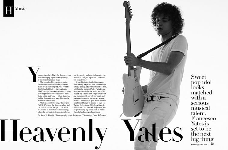 The engaging 20-year-old (with the voluminous fro and teen idol gaze) explains it was watching the 2003 comedy film School of Rock — in which actor Black portrays a wacky teacher of a ragtag crew of private school kids that he transforms into a rock band — when it dawned on him that music was something that he wanted to do full-time. “I always wanted to sing,” Yates tells HOLR. Watching the film was when it all clicked, he recalls. At age 11, he asked his parents to enrol him in music camp, where he got his initial sampling of what it’s like to play and sing in front of a live audience. “It’s just a passion I’ve never run away from.” It was this desire that led him to continue writing songs and form a band in high school, quickly get a manager (Chris Smith, who has also managed Nelly Furtado) and score a record deal at the tender age of 16. Indeed, the Toronto-born singer-songwriter and musician with his velvety vocals and confident demeanour has already accomplished a lot in a short span. Justin Timberlake himself has given Yates a co-sign on Twitter. And with the fall release his self-titled debut EP, a six-track project that was co-produced by big names such as Robin Hannibal and super producer/singer Pharrell Williams, Yates is ready for fame.