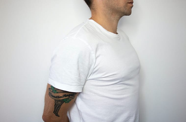 When you are choosing your T-shirt remember that it should always sit neatly against your shoulders at the base of your neck. You can tell that the fit is not right if your collarbone or pecs are visible. That means the T-shirt is too loose and you should try another size.