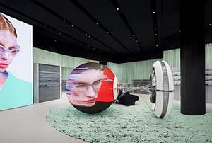 Known for its experimental approach to design, Gentle Monster blends high-fashion aesthetics with art and technology, creating statement sunglasses and frames with unique sculptural sensibility. This philosophy extends into its latest retail space, where guests are immediately confronted by a giant kinetic head installation—a hyper-realistic animated object composed of three expressive faces.