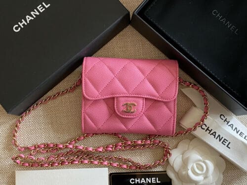 This pink classic quilted cardholder comes complete on a chain and features a button snap closure. Fashion lovers will adore this everyday necessity, which includes light gold-tone hardware. It is also designed with luxe caviar leather, making it a unique find that will enhance any classic bag collection and is sure to make any outfit pop.