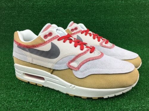 Boasting a fun colour palette, these Nike shoes use vintage golden brown tones as a base, and soft shades of grey and tan appear throughout the shoe. With bold red stitching and laces that accentuate the inside-out look, the red Air Max logo offers another vibrant touch down below. Sneaker lovers will appreciate the details of these bold must-haves- they make for the perfect addition to any collection!