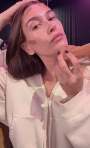The video opens with Hailey reaching into her bag and pulling out a few Rhode staples, starting with her signature skin prep duo: the Glazing Milk and Glazing Mist. She spritzes and smooths the products across her face, creating that instantly recognizable “glazed donut” glow her fans swear by. Her skin looks dewy, fresh, and effortlessly radiant before any makeup even touches her face.