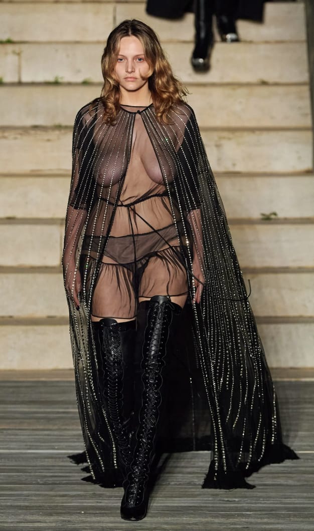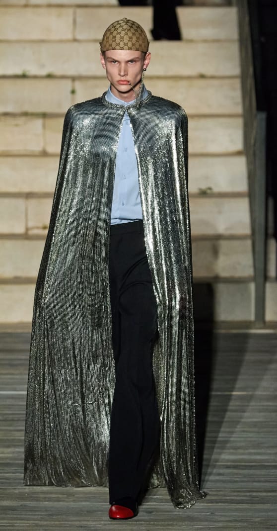 Many capped looks made it into the fashion show, from sheer black with studded pinstripes, to completely shimmery cloaks of amour. Many looks from the fashion show have brought back into fashion elements that would have been assumed gone.