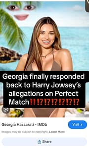 June 18, 2024– According to this TikTok video posted by user @mirarezik, Georgia has taken to social media to respond to the viral claims in which Melinda alleges that Harry kissed her while he was matched with Jess on Perfect Match season 2. Harry denies these allegations.
