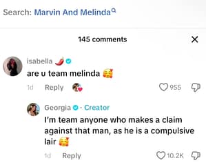 In the latest Perfect Match news, Georgia is responding to the viral claims that Melinda and Harry kissed. As you can see in the screengrab below, Georgia responded to a comment on one of her TikTok videos asking whether or not she is “Team Melinda” based on the he said/she said allegations floating around.