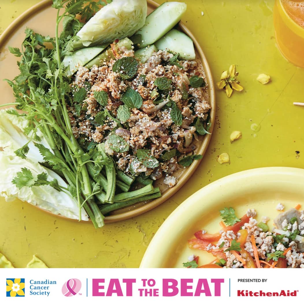 For my Eat to the Beat cooking class, I will be teaching participants how to make my Sour and Spicy Chicken Laab. It’s a dish that comes from northern Thailand and is one of my favourite things to eat. It has beautiful tangy and spicy elements and a bit of smokiness from the toasted rice. It’s also a healthy dish. I use ground chicken in my recipe, and we eat this dish accompanied by a variety of vegetables – cabbage, cucumber, and yard-long beans. I can’t wait to cook this dish with you!