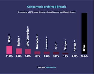Of all the brands on offer in the Australian marketplace, L’Oreal comes out on top, closely followed by Revlon. It is interesting how these high-class brands, aimed at those with more disposable income, come out on top. L’Oreal takes almost 12% of the market in Australia and is clearly one of the most loved brands.