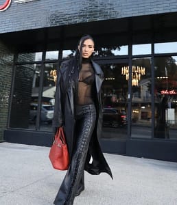 Tiesi’s all-black look is daring yet chic. The reality star opted for a long black trench, black pants, and a sheer black top. She chose to accessorize the look with a fiery red bag. This look can easily be reworked slightly for the office. Simply swap the sheer top with an opaque version and the lace-up pants with some trousers to make this monochromatic outfit in-office acceptable.